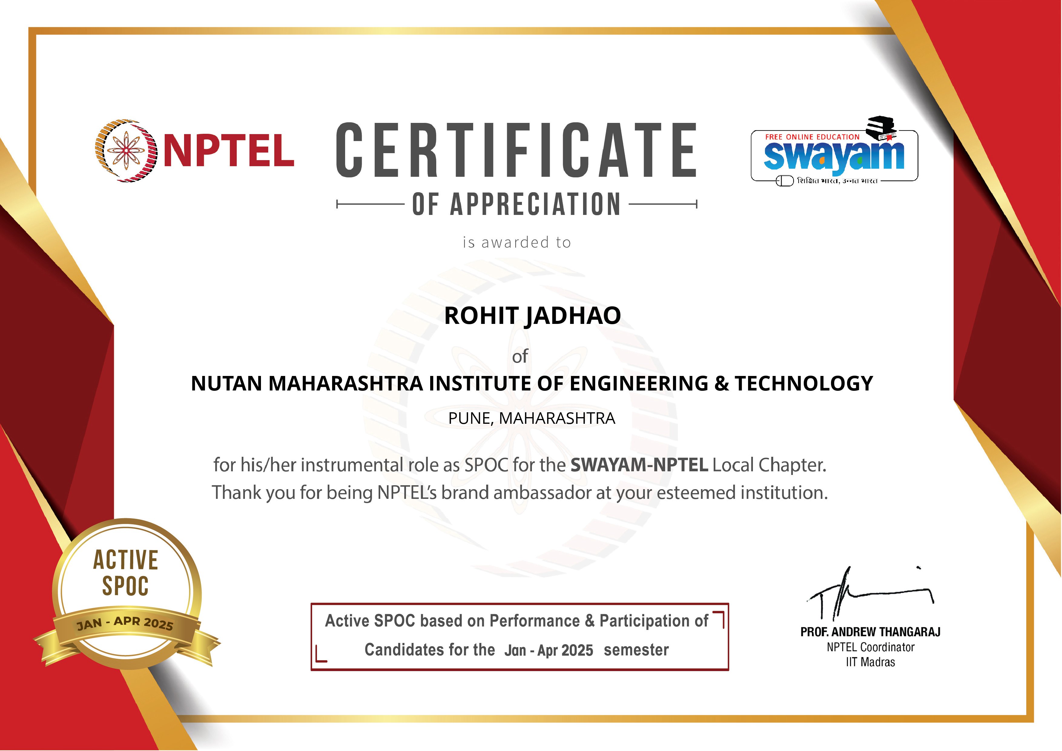 Awarded Certificate of Appreciation (Jan–April 2025 Semester) for instrumental role as SPOC of the SWAYAM-NPTEL Local Chapter, contributing as NPTEL’s brand ambassador at Nutan Maharashtra Institute of Engineering & Technology.