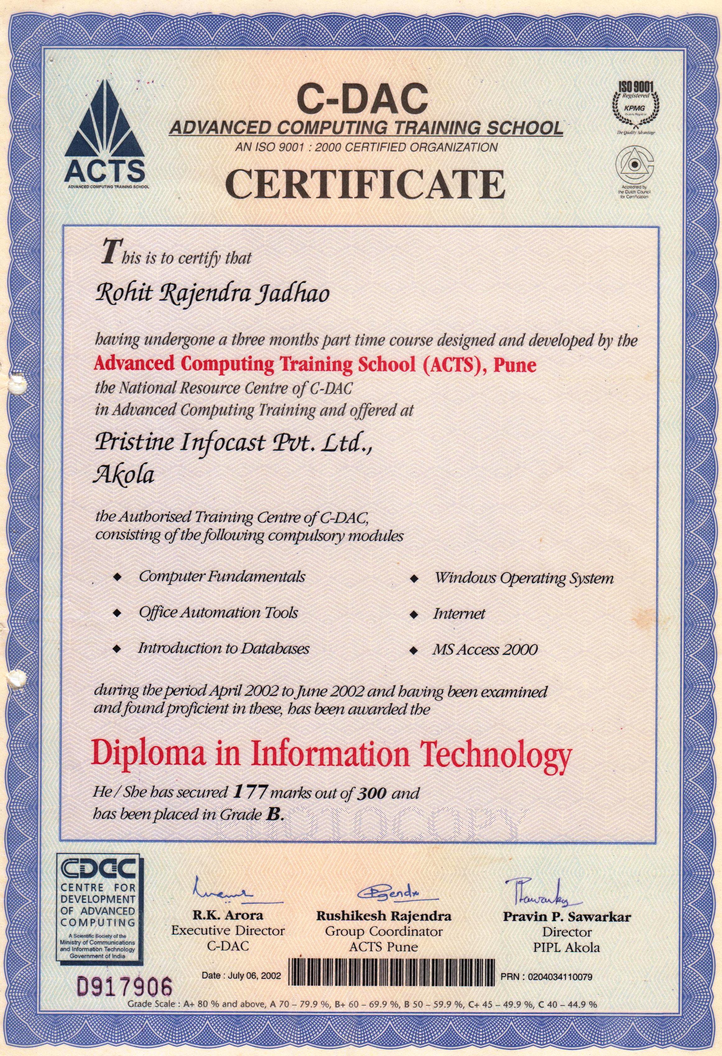 Completed a Diploma in Information Technology from C-DAC (Advanced Computing Training School) Pune, securing Grade B with a score of 177/300.