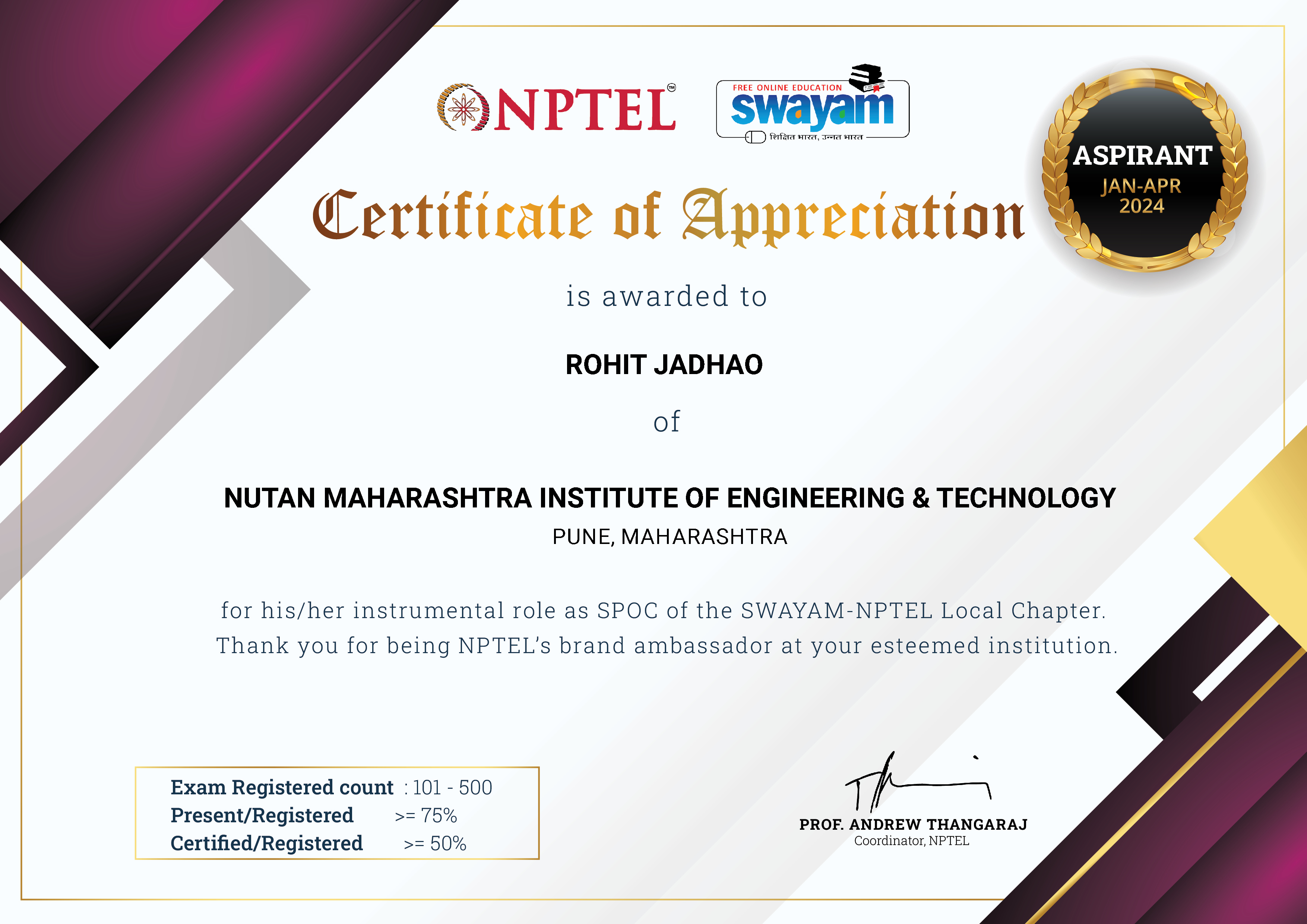 Awarded Certificate of Appreciation (Jan–Apr 2024) for instrumental role as SPOC of the SWAYAM-NPTEL Local Chapter, contributing as NPTEL’s brand ambassador at Nutan Maharashtra Institute of Engineering & Technology.