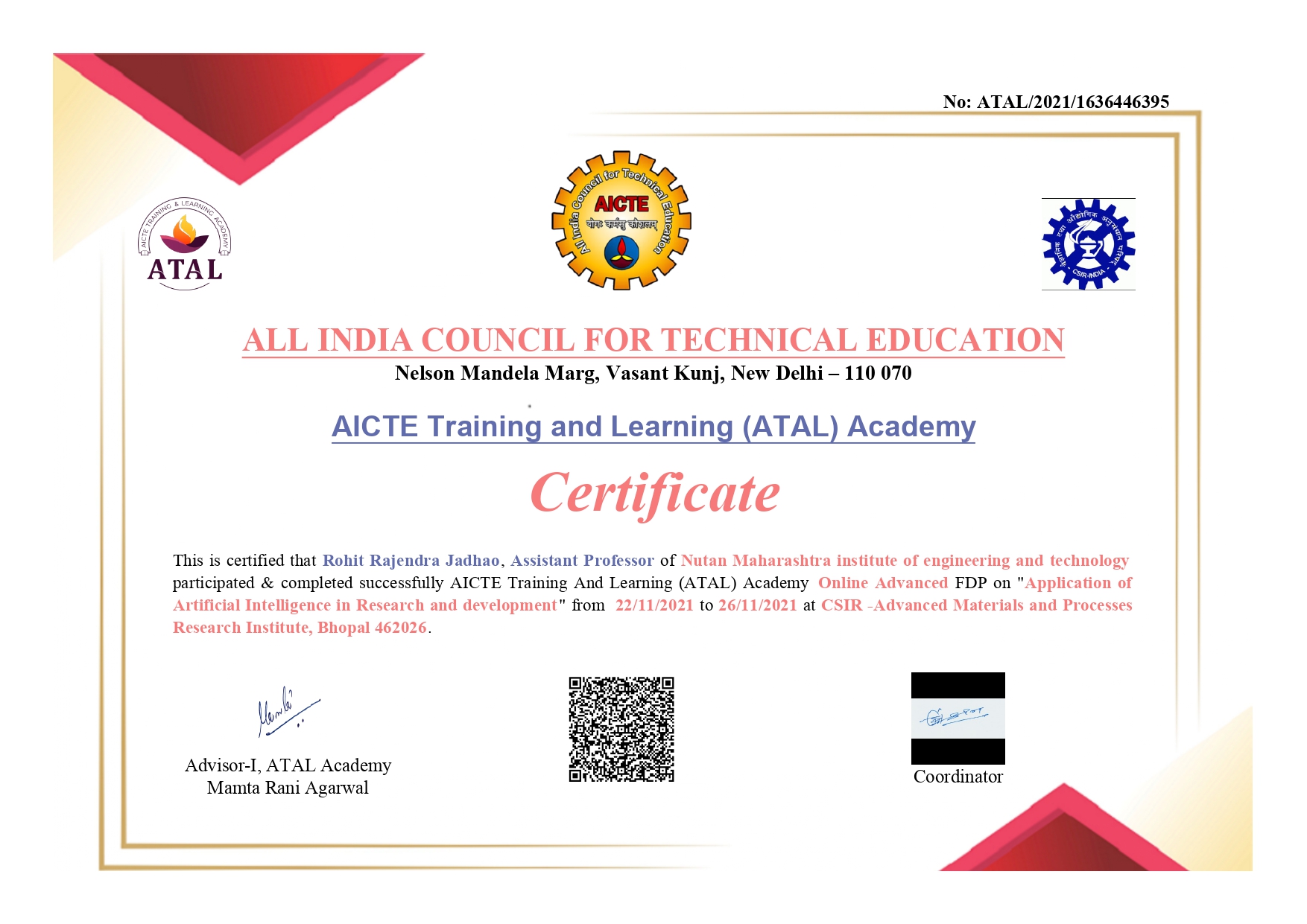 ATAL-AICTE approved Faculty Development Program on “Application of Artificial Intelligence in Research and development” by CSIR -Advanced Materials and Processes Research Institute, Bhopal from 22nd to 26th Nov 2021.