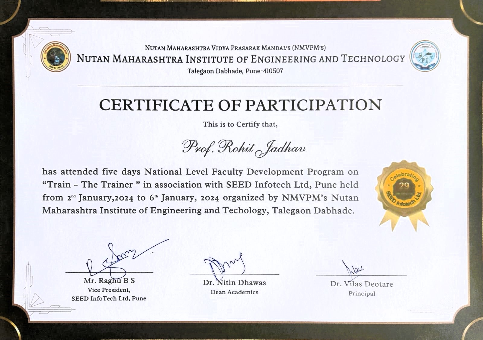 One week National Level Faculty Development Program on "Train the Trainer" in association with SEED Infotech Ltd, Pune at PCET's Nutan Maharashtra Institute of Engineering and Technology, Talegaon Dabhade held on 2nd to 6th January 2024.