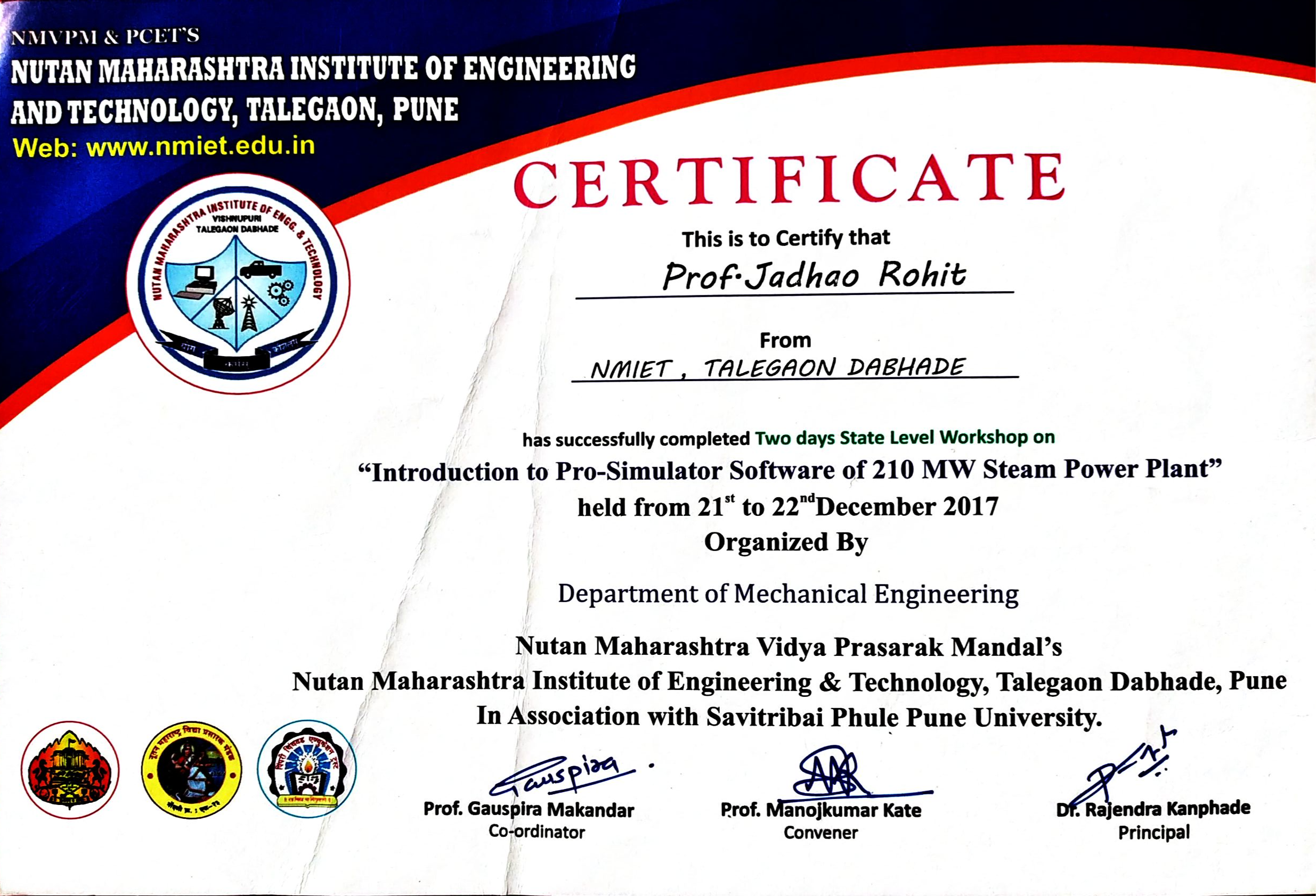 Two day Workshop on “Pro-Simulator 210 MW Thermal Power plant” at PCET's Nutan Maharashtra Institute of Engineering and Technology, Talegaon Dabhade from 21th & 22nd December 2017.