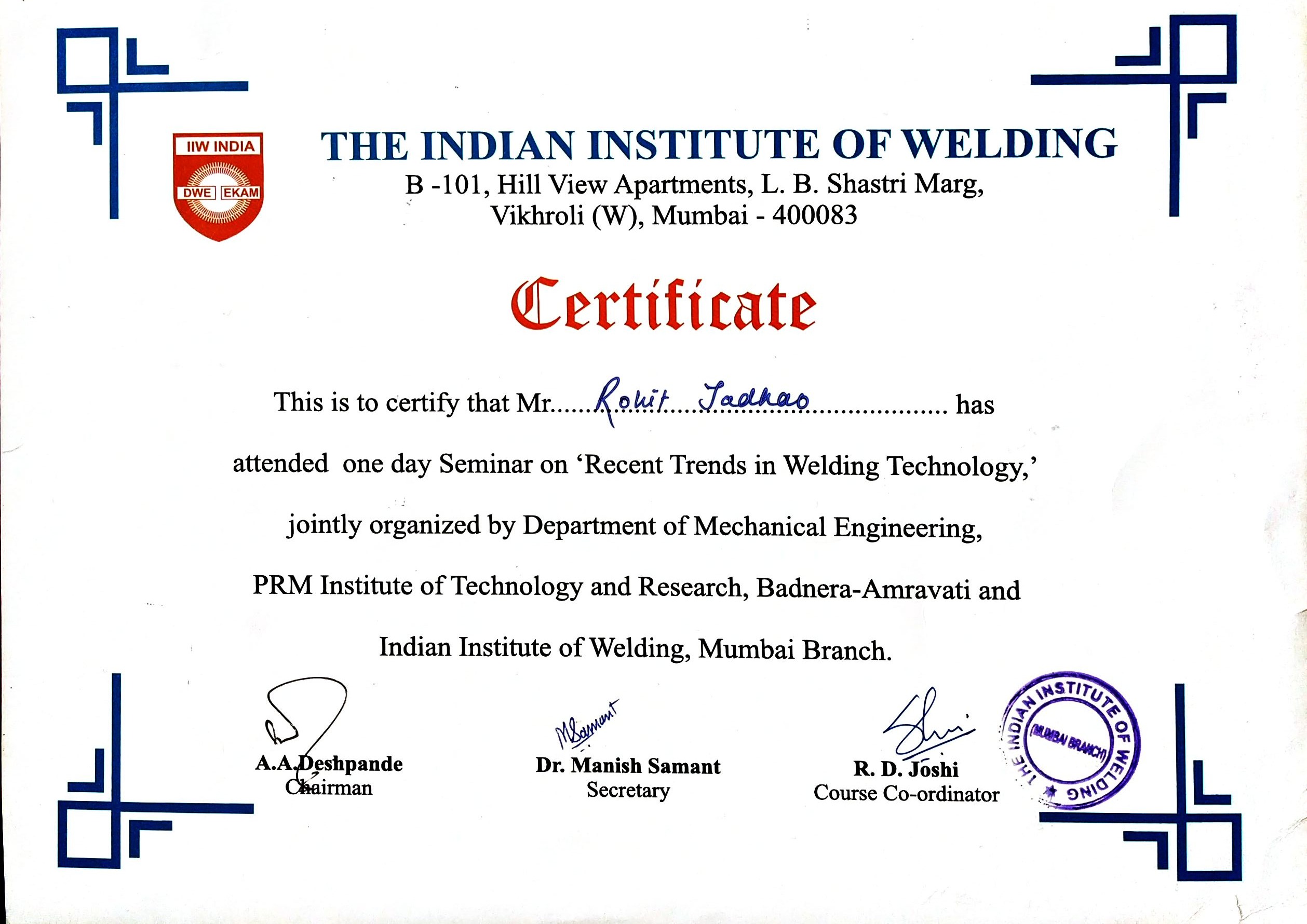 One day workshop on “Recent Trends in Welding Technology” at P.R.M.I.T&R College of Engineering Amravati from 19th September 2009.