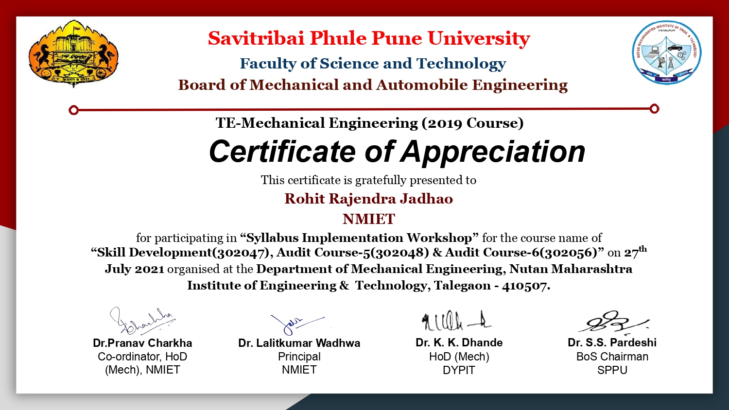 SPPU Syllabus Implementation Workshop for "Skill Development & Audit Course" at PCET's Nutan Maharashtra Institute of Engineering and Technology, Talegaon Dabhade on 27th July 2021.