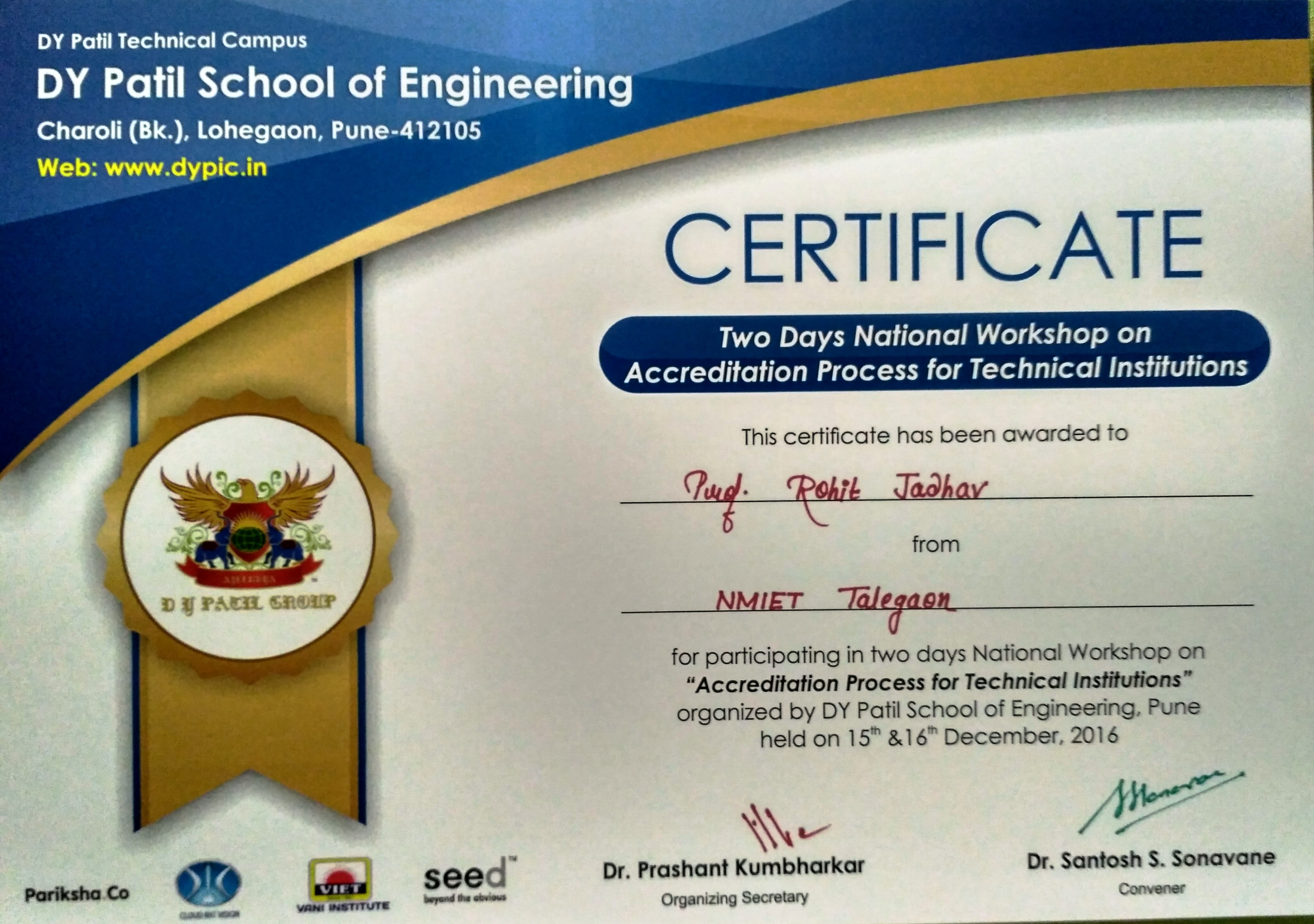 Two days workshop on “Accreditation Process for Technical Institutions” at D Y Patil School of Engineering, Lohegaon from 15th & 16th Dec 2016.