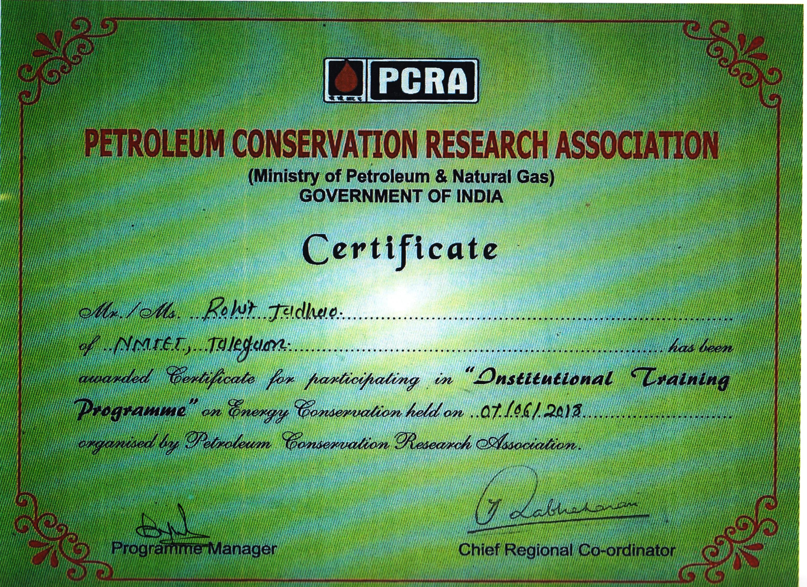 One day Institutional Training by "Petroleum Conservation Research Association (PCRA), Government of India" at PCET's Nutan Maharashtra Institute of Engineering and Technology, Talegaon Dabhade on 7th June 2018.