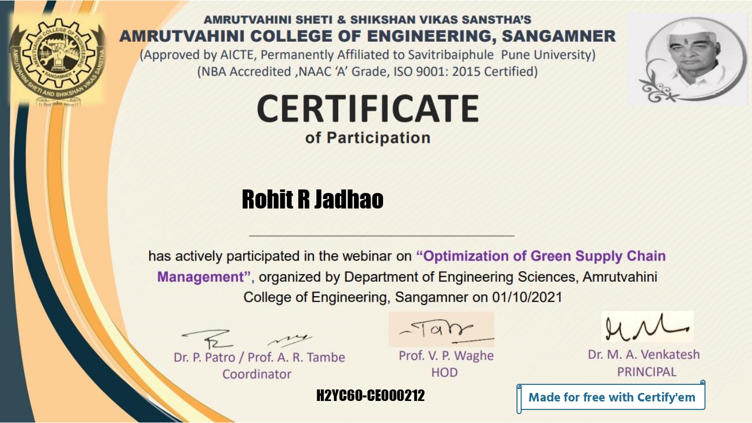One day Webinar on "Optimization of Green Supply Chain Management" by Amrutvahini College of Engineering, Sangamner, Dist: Ahmednagar, Maharashtra, India held on 1st Oct 2021.