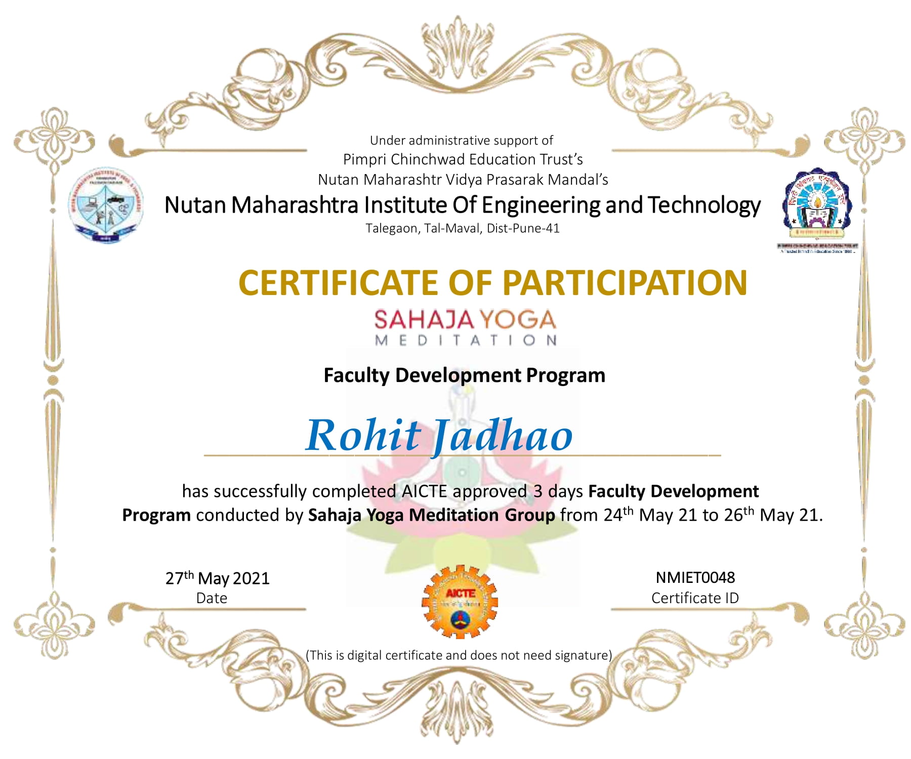 AICTE approved Three day Faculty Development Program on “Sahaja Yoga Meditation Group” at PCET's Nutan Maharashtra Institute of Engineering and Technology, Talegaon Dabhade from 24th May to 26th May 2021.