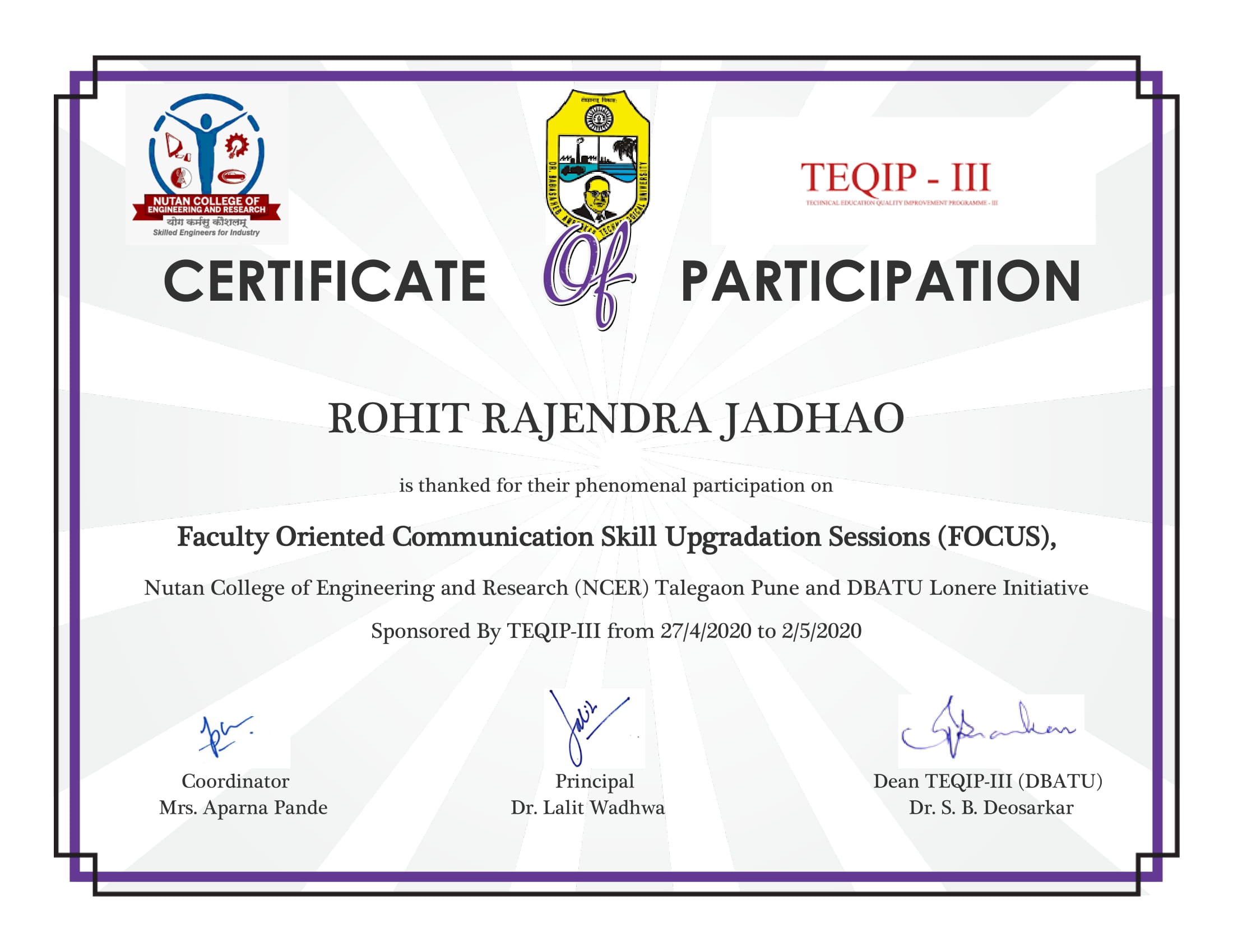 Faculty Development Program on "Faculty Oriented Communication Skills Upgrade sessions" (FOCUS) at Nutan College of Engineering and Research & BATU,Talegaon Dabhade from 27th April to 02nd May 2020.