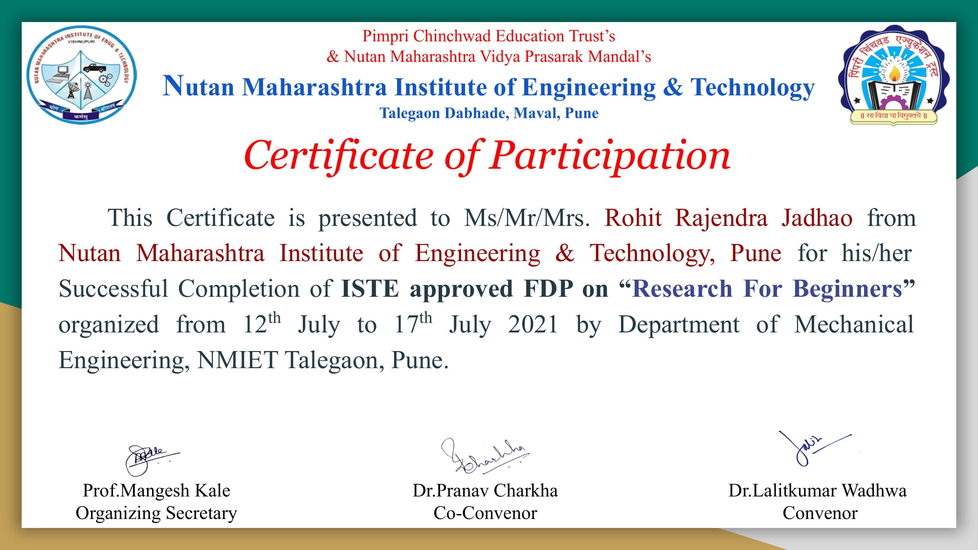 ISTE Approved Faculty Development Program on "Research for Beginners" at PCET's Nutan Maharashtra Institute of Engineering and Technology, Talegaon Dabhade from 12th July to 17th July 2021.
