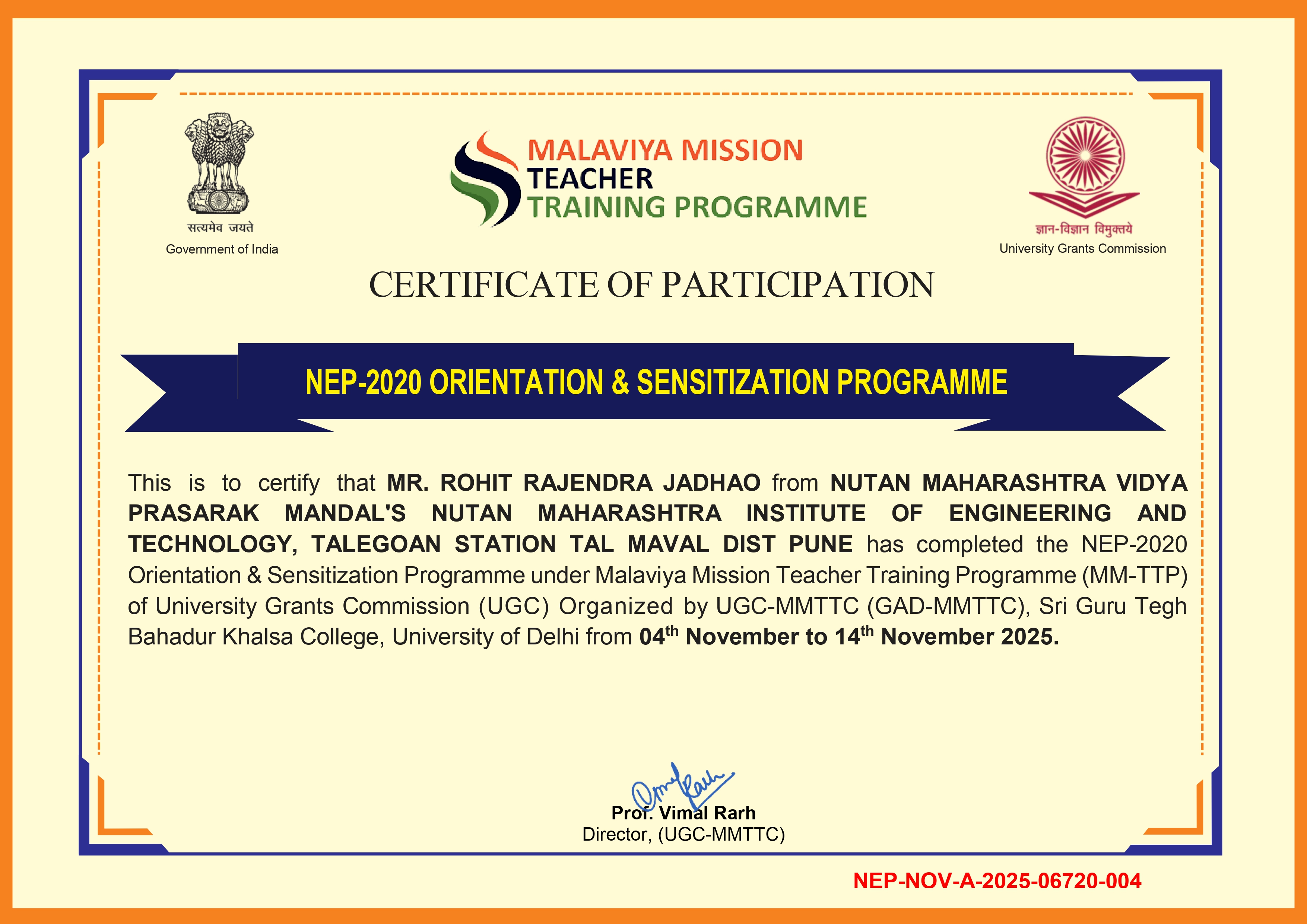NEP Orientation & Sensitization Programme organized by UGC-MMTTC (also GAD-MMTTC), SGTB Khalsa College, University of Delhi from 04 November to 14 November 2025.
