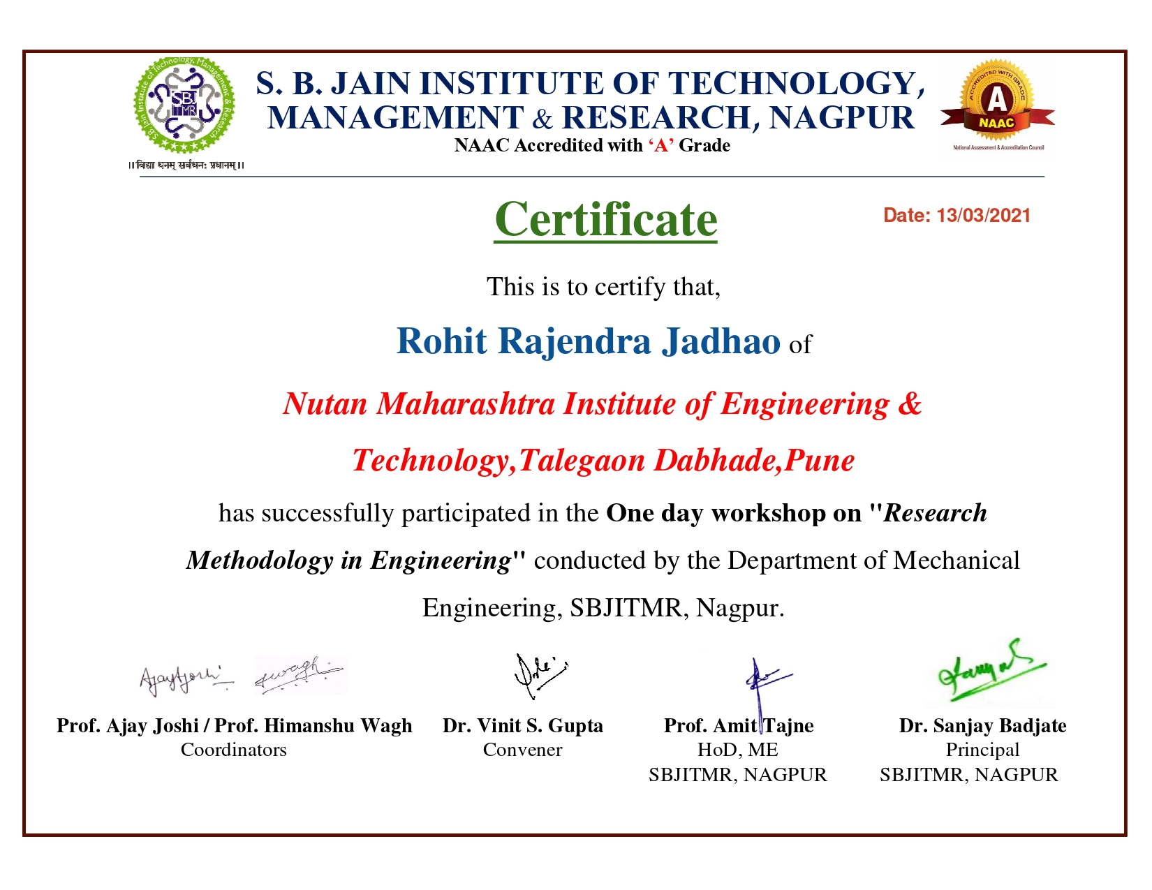 One day Workshop on “Research Methodology in Engineering” by S. B. Jain Institute of Technology, Management & Research, Nagpur on 13th March 2021.