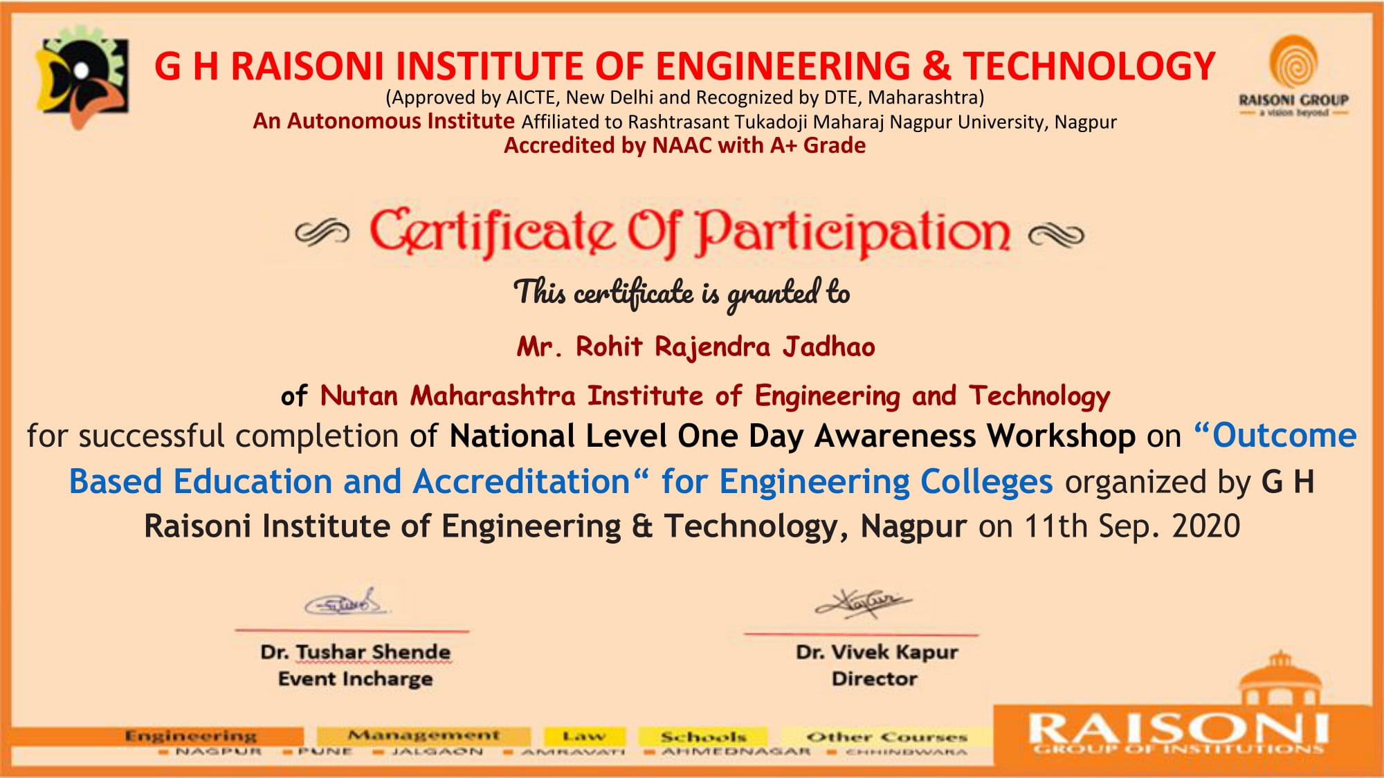 One Day Awareness National Level Workshop on “Outcome Based Education and Accreditation for Engineering Colleges" by G H Raisoni Institute of Engineering & Technology, Nagpur on 11th September 2020.
