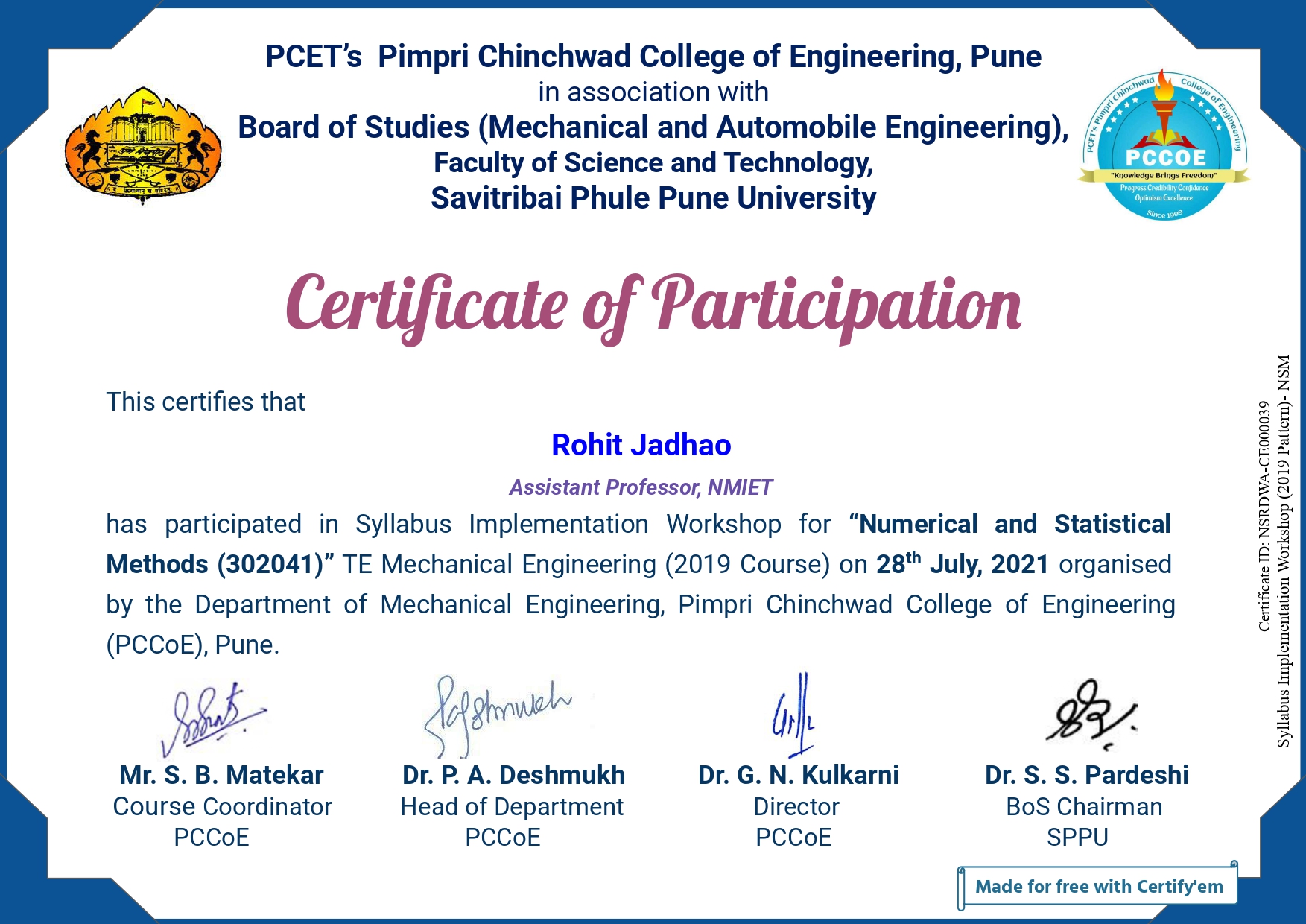 SPPU Syllabus Implementation Workshop for "Numerical & Statistical Methods" at Pimpri Chinchwad College Of Engineering,Akurdi on 28th July 2021.