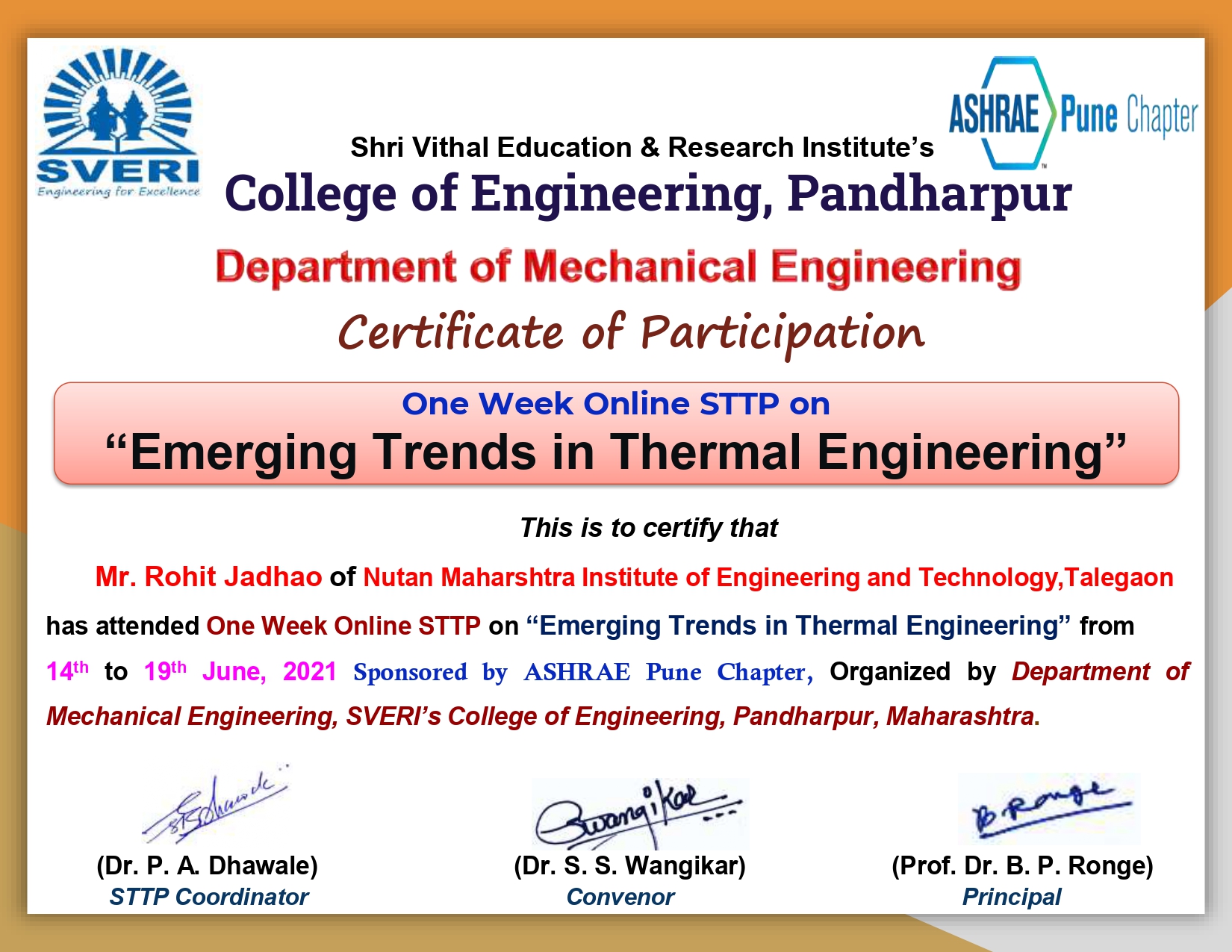 ASHRAE Sponsored Faculty Development Program on "Emerging Trends in Thermal Engineering" at SVERI's College of Engineering, Pandharpur from 14th June to 19th June 2021.